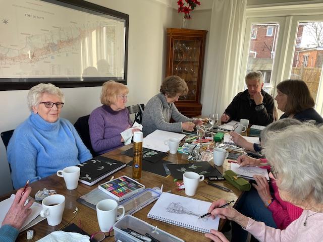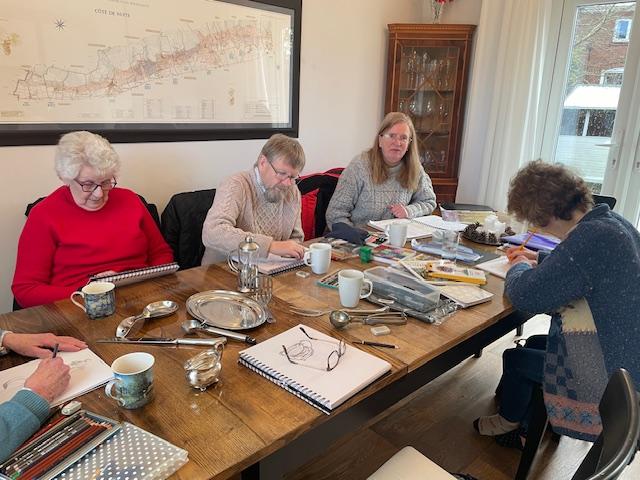 Sketchers meet on the first & forth Monday of each month at my home. We draw a variety of subjects including glass , old boots , fruits and flowers. We have a break for tea, coffee, biscuits and a chat. We are looking forward to the summer when we can meet outside.